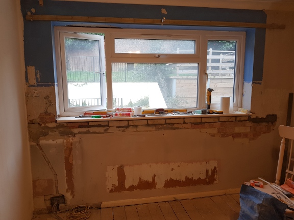 Again in the new Bedroom 2, the window wall needed quite a bit of preparation before plastering. This had been part of the old kitchen, with cupboards and a worksurface running the full width and beyond into what is now the ensuite. Even longer ago, before that kitchen was fitted, there had been a radiator underneath the window, the evidence of which can be seen. Directly under the window, along the worksurface, the wall was tiled and there were multiple sockets. When these were removed, all the plaster came off too, and some of the bricks under the window sill were so loose and damaged that I had to remove the window sill entirely and re-lay replacement bricks (this has already been done in this photo), which I rescued and reused out of those removed when the new doorway from the landing to the first floor cloakroom was knocked through. There was also a now obsolete vent hole which I bricked up and various other holes and channels that had to be made good before the whole wall could be skimmed.